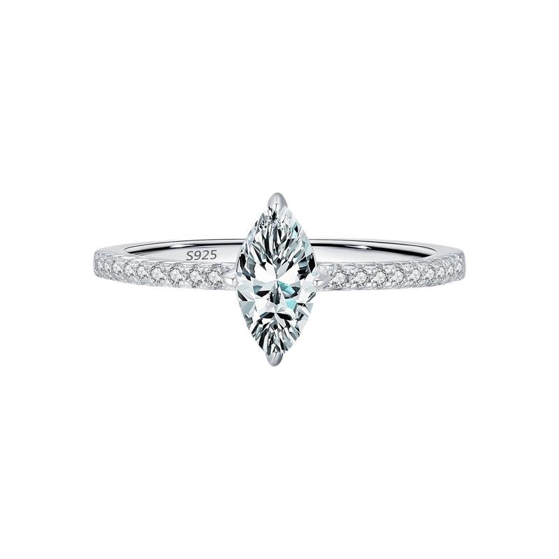 This elegant marquise moissanite ring combines classic and modern design, perfectly showcasing luxury and sophistication. The central marquise moissanite sparkles with captivating brilliance, surrounded by a delicate S925 band of smaller moissanite that add extra radiance and charm.
